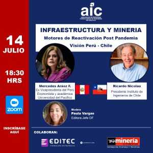 Dialogar en torno a la relevancia que tendrán sectores como la minerÃa y la infraestructura en la recuperación económica una vez superada la actual crisis sanitaria es uno de los objetivos del webinar “Infraestructura y MinerÃa, motores de reactivación post pandemia, visión Perú – Chileâ€, que está organizando la Asociación de Empresas Consultoras de IngenierÃa de Chile (AIC), y que se realizará el próximo martes 14 de julio.