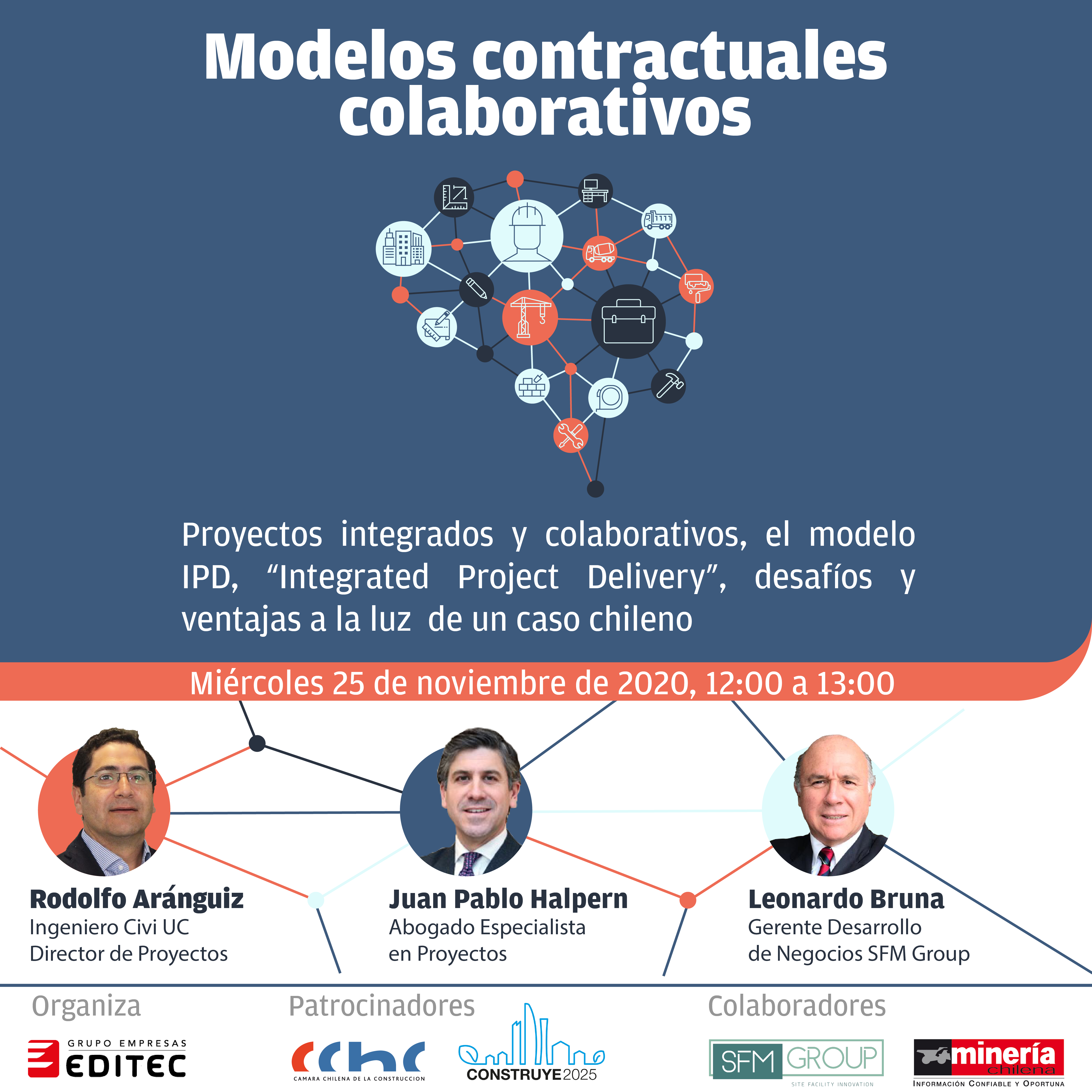 Ante esta realidad, los modelos tradicionales de contratación han ido dando paso a dinámicas colaborativas, que permitan ejecutar exitosamente el proyecto asignando de mejor manera sus riesgos entre las múltiples partes, aspecto que será abordado en el webinar “Modelos contractuales colaborativosâ€, el que girará en torno a los beneficios que entregan herramientas como el modelo IPD “Integrated Project Deliveryâ€, que apuntan a la generación de enfoque de trabajo en común entre las empresas involucradas.