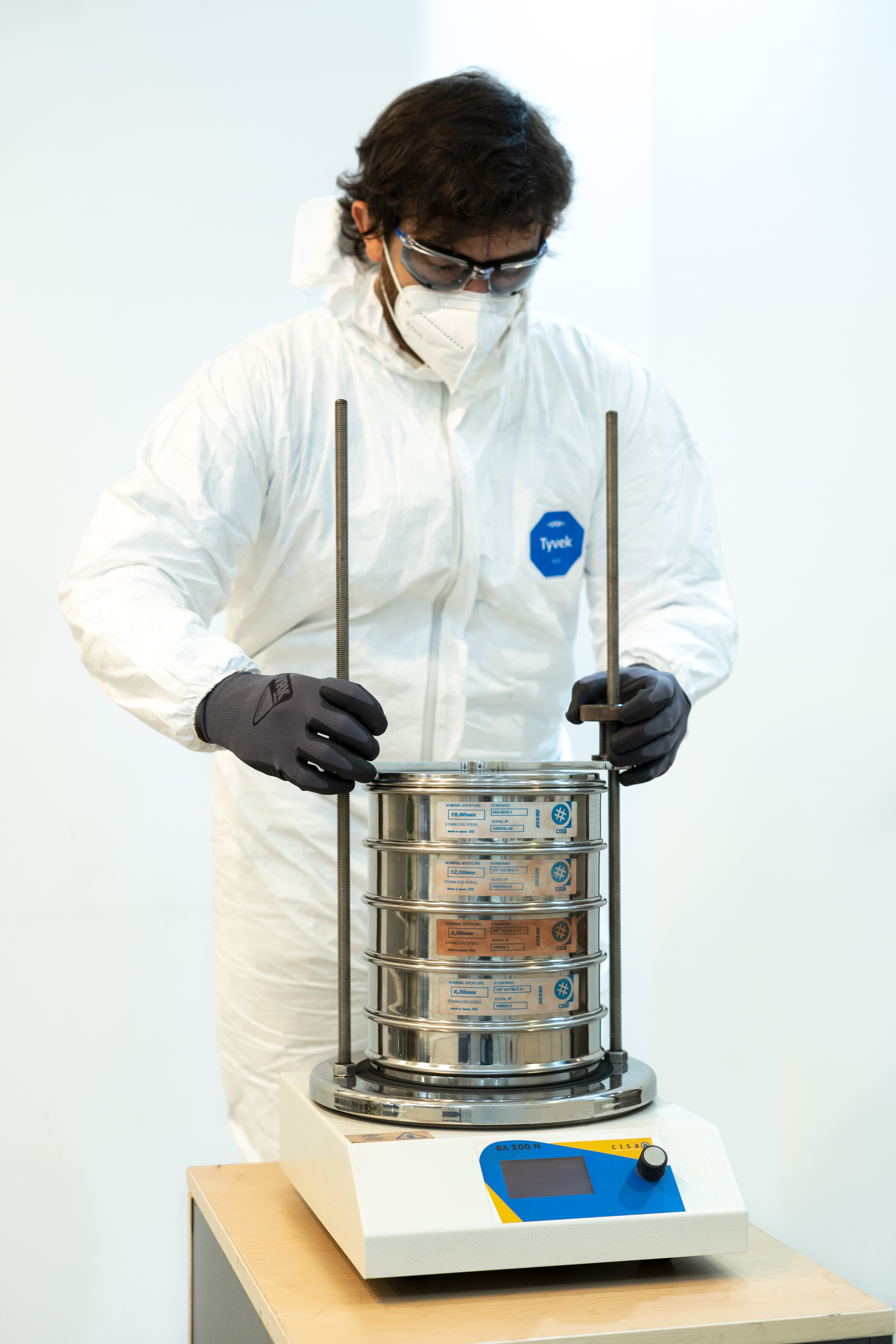 La instalación contará con equipos para caracterización de materiales granulares como cohesión-consolidación, fricción-adhesión, densidad aparente, granulometrÃa, humedad de saturación, ángulo de reposo y descarga, y ángulo de sobrecarga.