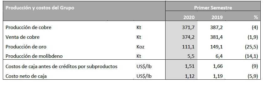 Arriagada concluyó que “como las perspectivas siguen siendo inciertas, a pesar del desempeño de nuestras operaciones en el primer semestre de 2020, mantenemos nuestra guÃa para todo el año en el extremo inferior del rango original de 725.000 a 755.000 toneladas de cobre, a un costo neto de caja de US$1,20 la libraâ€.