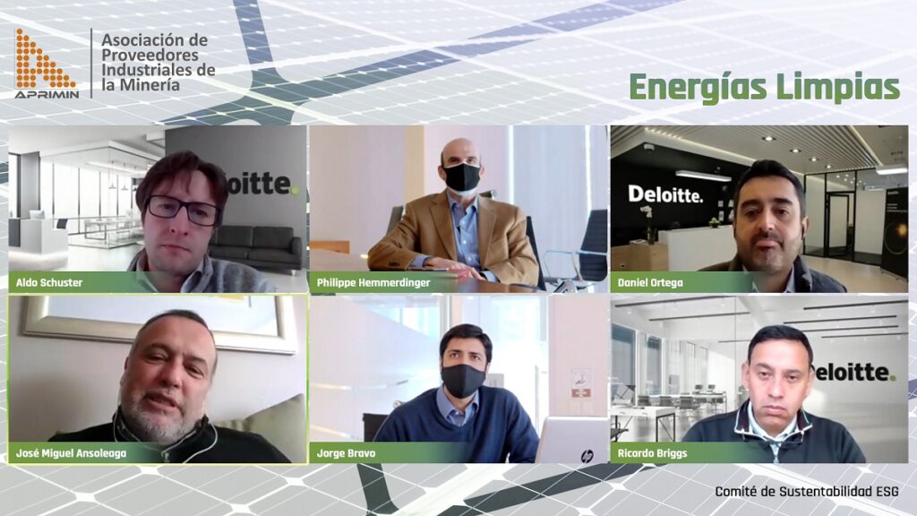La Asociación de Proveedores Industriales de la MinerÃa (Aprimin), a través de su Comité de Sustentabilidad ESG y en conjunto con la consultora Deloitte, realizaron una charla en torno a la importancia que poseen las energÃas limpias, a cargo de los expositores Daniel Ortega, director lÃder de EnergÃa y Utilities de ConsultorÃa y Aldo Schuster, consultor en Transformación de Operaciones E&R, respectivamente, de Deloitte Chile.