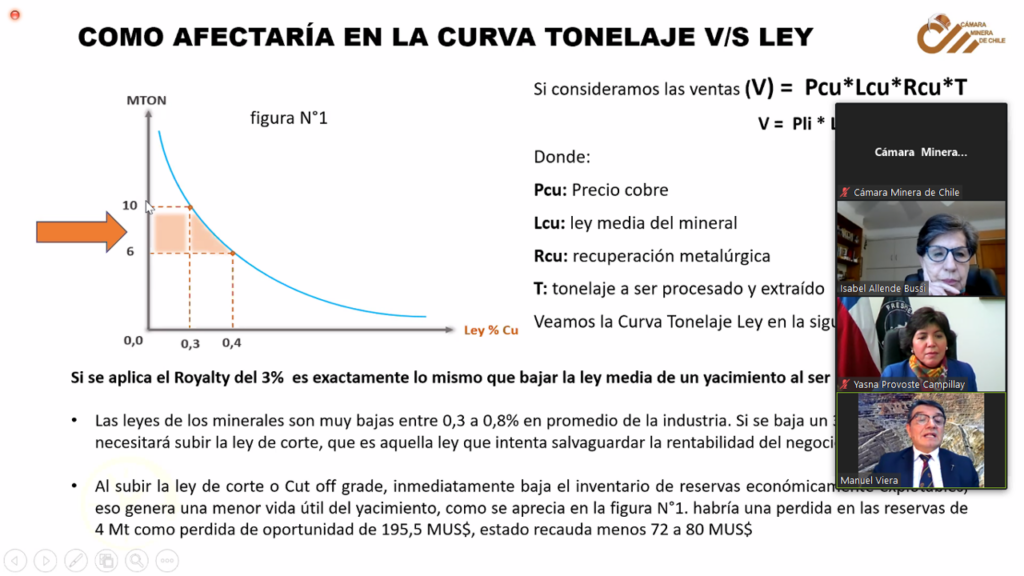 Además, explicó que al subir la ley de corte o Cut off grade, inmediatamente baja el inventario de reservas económicamente explotables, eso genera una menor vida útil del yacimiento. Si se tenÃa antes una ley de corte de 0,3% con una reserva económicamente explotable de 10 millones de toneladas, al aplicar el impuesto de 3% sobre ventas, que es lo mismo que bajar la ley media en el mismo %, obligatoriamente hay que subir la ley de corte a 0,4%, indicó.