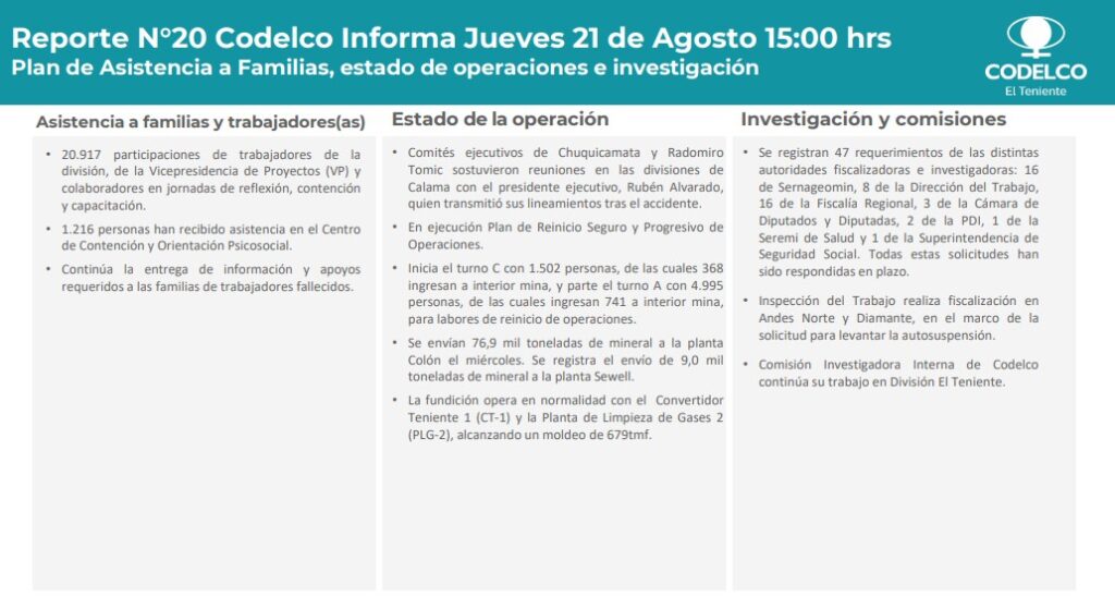 Codelco entregó un nuevo reporte sobre las acciones desplegadas a raÃz del accidente ocurrido en División El Teniente.