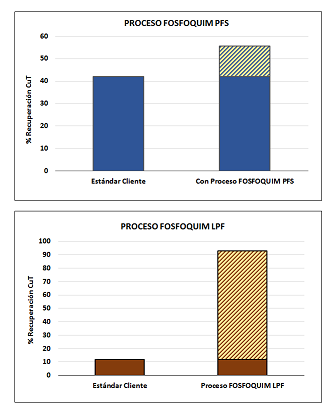 A continuación se muestran algunos resultados obtenidos al procesar ciertos minerales con dos de los procesos patentados de FOSFOQUIM, y comparar los resultados con el estándar. En ambos casos se aprecia un interesante aumento de la recuperación de cobre total gracias al uso de estas tecnologÃas: