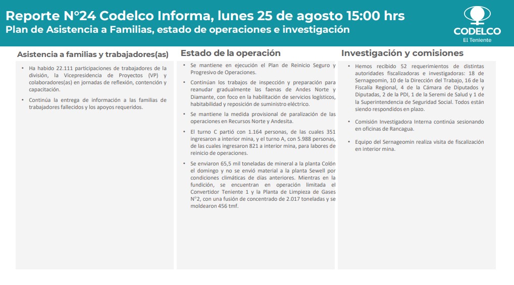 En tanto, la Comisión Investigadora Interna continúa sesionando en las oficinas de Rancagua, mientras que el equipo del Sernageomin realizó visitas de fiscalización en interior mina.