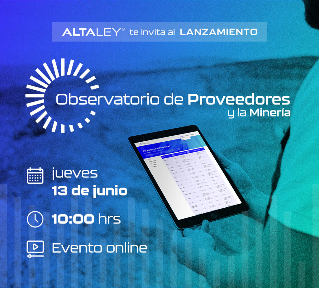 La Corporación Alta Ley realizará este jueves 13 el lanzamiento oficial del “Observatorio de Proveedores y la MinerÃaâ€, plataforma pública y abierta que tiene como propósito principal poner a disposición de la comunidad los indicadores más relevantes de la industria minera y sus proveedores, asà como habilitar un catálogo detallado de proveedores mineros.