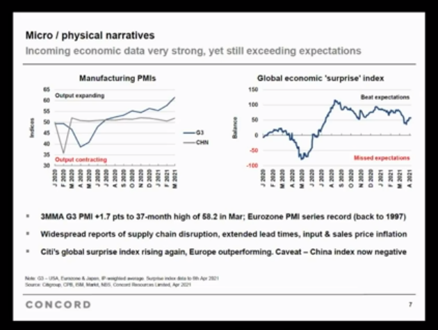 Por este camino, el director de investigación manifestó que “otra cosa que ha estado en muchos titulares en general, mucha charla, es el aumento o al menos la percepción de los mayores riegos de inflación. Esto se refleja, por supuesto, en cierta medida, en el aumento de los rendimientos de los bonos, aunque algunos comentaristas hacen una buena interpretación de esto y dicen que los rendimientos de los bonos están aumentando más porque el crecimiento económico se está acelerando, no tanto porque las expectativas de inflación están aumentandoâ€.