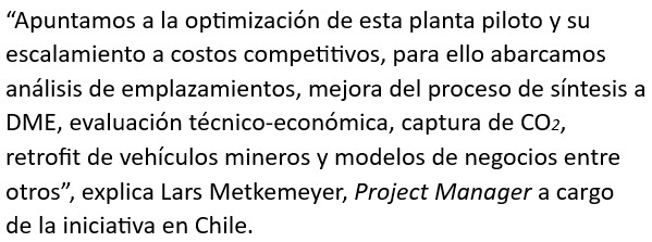 Junto a seis centros más de Fraunhofer Alemania, y la empresa privada, está deÂsarrollando el proyecto Power-to-MEDME para la instalación de una planta piloto en la Región de Antofagasta que produzca a escala industrial hidrógeno verde solar y sus derivados: metanol (combustible para el sector marÃtimo, aeronáutico e industria quÃmica), y Dimetil Éter (DME).