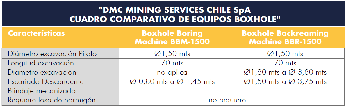 El ejecutivo afirma que DMC utiliza en la actualidad dos métodos de excavación vertical con los equipos BoxholeBBM-1500 y BBR-1500. “Estas máquinas tienen un alcance de excavación de aproximadamente 70 m de altura, desarrollando excavaciones ciegas ascendentes en 1,5 m de diámetro. Pueden alcanzar un rendimiento con 1,5 m de excavación por hora en roca de buena calidad, lo cual es un alto rendimiento para una máquina de excavación vertical.