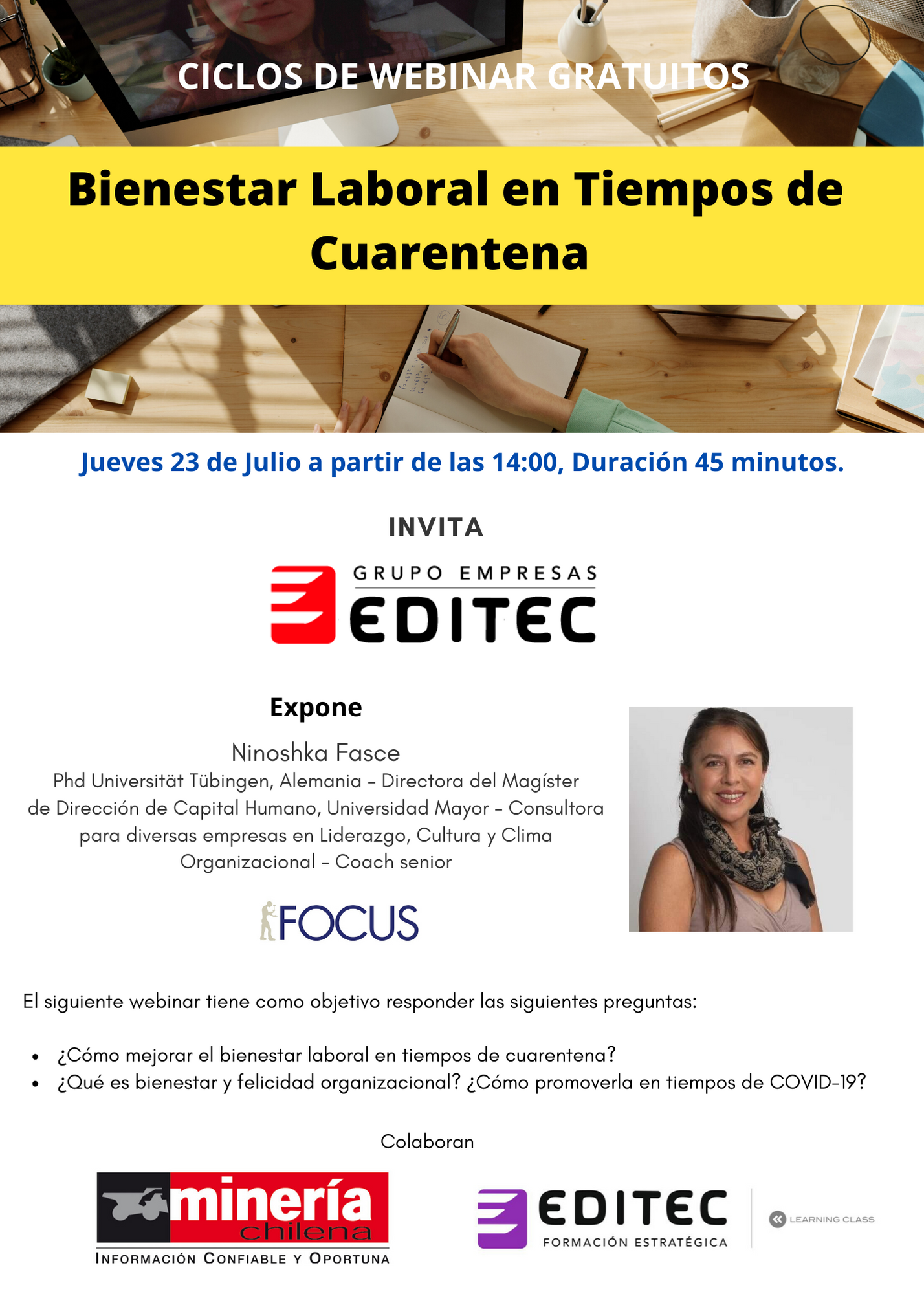 La actividad, que contará con la exposición de Ninoshka Fasce, directora del MagÃster de Dirección de Capital Humano de la Universidad Mayor, quien es además coach senior y consultora para diversas empresas en Liderazgo, Cultura y Clima Organizacional, forma parte de un ciclo de webinar gratuitos que desarrolla el grupo de Empresas Editec, durante el cual se tratarán temas relacionados a la innovación, legales, operacionales y de capital humano, enfocados a las contingencias que se han generado en nuestro paÃs.