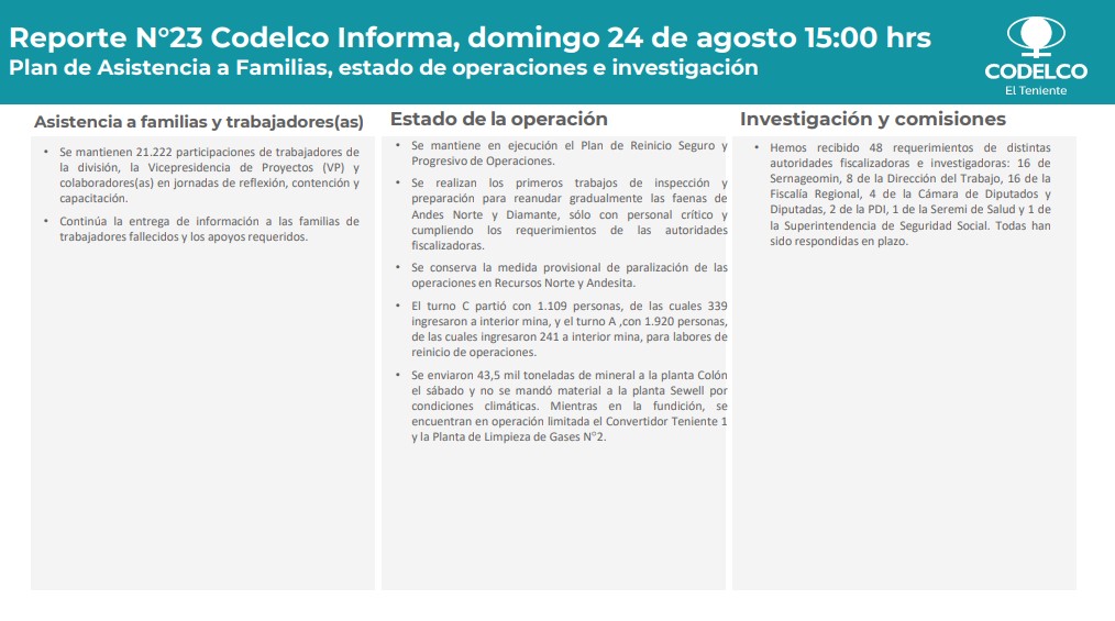 Durante el turno C ingresaron 1.109 personas, de las cuales 339 accedieron al interior mina, y en el turno A, participaron 1.920 personas, con 241 que ingresaron a interior mina para labores de reinicio de las operaciones. El sábado se enviaron 43,5 mil toneladas de mineral a la planta Colón; y no se mandó material a la planta Sewell debido a condiciones climáticas adversas. En la fundición, en el Convertidor Teniente 1 y la Planta de Limpieza de Gases N°2 operan con algunas limitaciones.