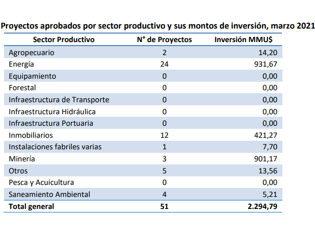Junto con ello, se destaca que en marzo de 2021 se aprobaron tres proyectos del sector MinerÃa, que consideran una inversión total de US$901,17 millones.