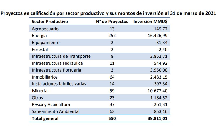 Respecto a los proyectos en calificación1 ambiental al 31 de marzo de 2021, se contabilizaron 550 proyectos en