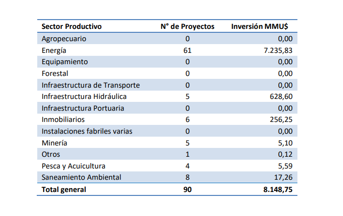 A partir de los datos estadÃsticos registrados en la plataforma electrónica del SEIA (e-SEIA), fue posible contabilizar el ingreso de 90 proyectos de inversión durante marzo, de distintos sectores productivos, los cuales representan una inversión total de MMU$ 8.148,75.