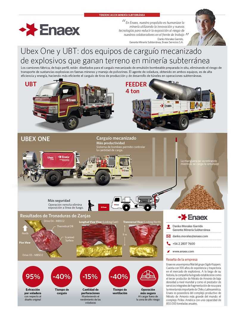 “En Enaex nuestro propósito es humanizar la minerÃa, utilizando la innovación y nuevas tecnologÃas para disminuir la exposición al riesgo de los operadores en el frente de trabajo. Al mismo tiempo, nos esforzamos siempre en responder de forma ágil a las necesidades de nuestros clientes, con el objetivo de aumentar la productividad en sus procesos de perforación y tronaduraâ€, subraya Danko Morales Garrido, gerente MinerÃa Subterránea de la empresa.