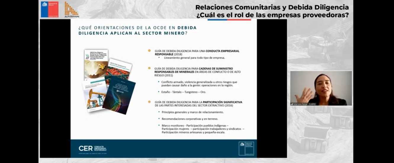 En el marco de la actividad, que fue moderada por Fernando Manzur, jefe del Departamento de Participación y Relaciones Comunitarias del Ministerio de MinerÃa, Marcela Paiva, Punto Nacional de Contacto OCDE, se refirió al concepto de debida diligencia, explicando que se trata de un proceso continuo que la empresa puede llevar a cabo para identificar y responder a impactos negativos reales o potenciales relacionados con sus propias operaciones, asà como a lo largo de sus cadenas de suministro y relaciones comerciales.