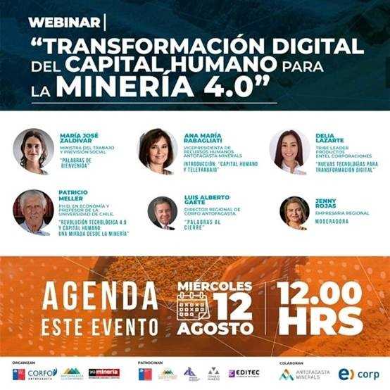 Propiciar el diálogo en torno a la forma cómo los trabajadores del sector minero deben prepararse para responder a los desafÃos que conlleva la creciente integración de nuevas tecnologÃas por parte de la industria, es uno de los objetivos del webinar “Transformación digital del capital humano para la minerÃa 4.0â€, que es organizado por el Programa Estratégico Regional Clúster Minero de Corfo Antofagasta, y que se realizará este miércoles 12 de agosto al mediodÃa.