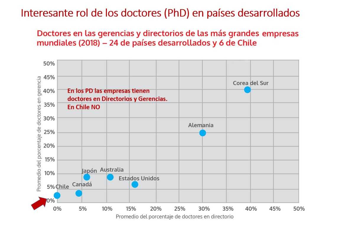 Además, menciona que “es interesante el rol de los doctores (PhD) en las empresas grandes de los paÃses desarrollados, quienes participan bastante en los directorios y en las gerencias. En Corea del Sur 40% de los directores y de los gerentes tiene un doctorado. En Alemania, 30% de los directores y 25% de los gerentes tiene un doctorado. En Chile casi no hay doctores ni en las gerencias y ni en los directoriosâ€.