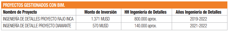 “Hoy estamos desarrollando el proyecto Diamante para Codelco El Teniente con metodologÃa BIM , con expectativas en lograr alto estándar de eficiencia en diseño y construcción.†agrega.