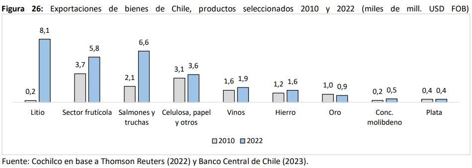 “Ha llegado a superar a las exportaciones de industrias consolidadas como la frutÃcola y la salmonicultura. Más aún, prácticamente ha doblado al sector de celulosa, papel y otros y más que ha triplicado a la industria vitivinÃcola. En relación a otros minerales, vemos que ha superado con amplitud al hierro y el oro, otrora los dos mayores sectores mineros del paÃs luego del cobre. No obstante, si bien no se expone en la gráfica, el cobre naturalmente continúa siendo el producto principal del paÃs, con exportaciones de US$44.662 miles de millones en 2022 (Banco Central de Chile, 2023), lo que equivale a unas cinco veces las exportaciones de litio”, consigna el reporte.