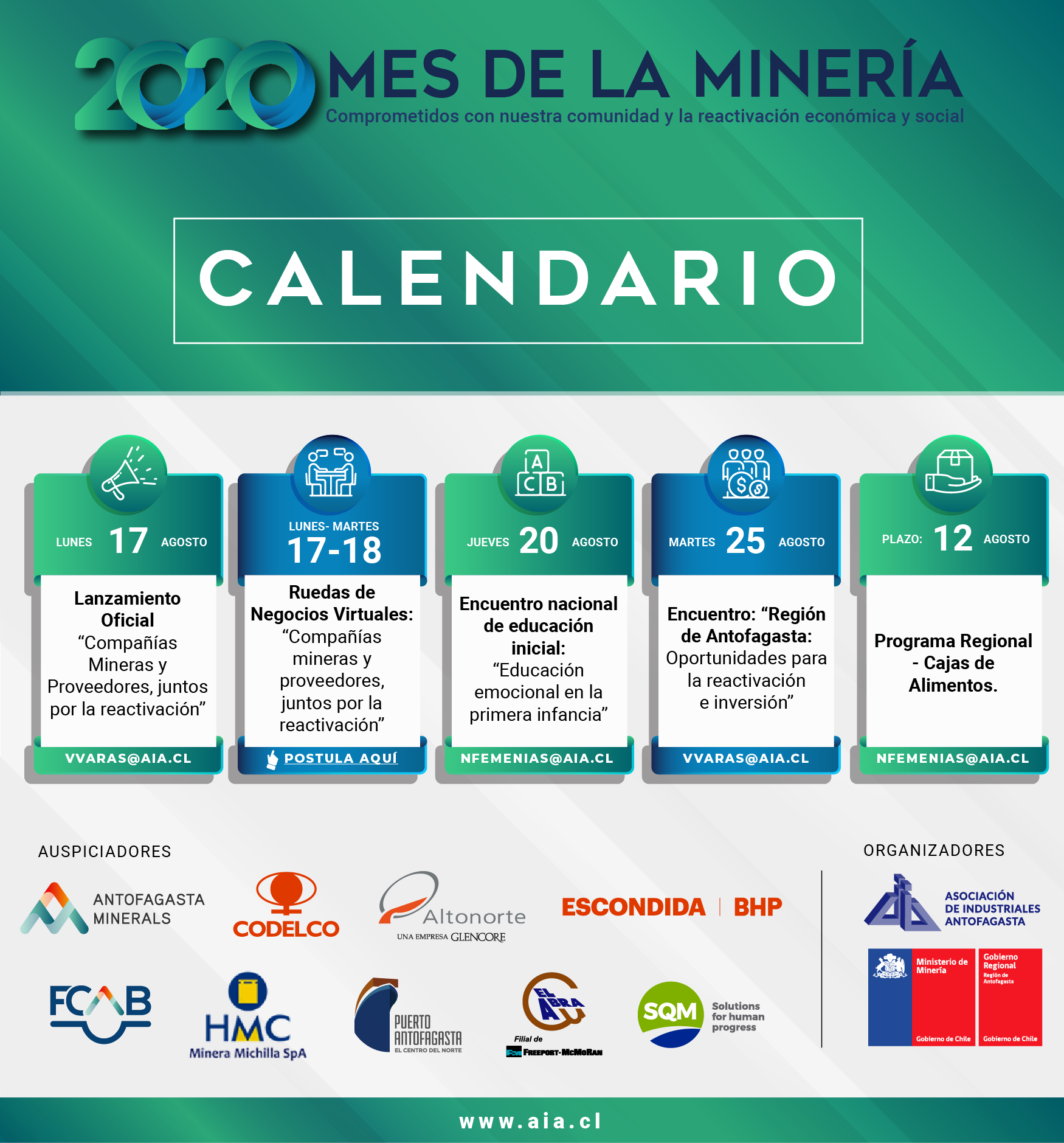 Finalmente, el martes 25 de agosto a las 10:00 horas, la AIA diseñó la ejecución del encuentro “Región de Antofagasta: Oportunidades para la Reactivación e Inversiónâ€, que considera la intervención de importantes compañÃas mineras. Para mayor información sobre cada una de las actividades y poder participar de ellas es posible escribir a vvaras@aia.cl.