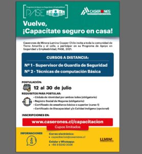 Los interesados podrán postular hasta el 30 de julio, a través de la página www.caserones.cl/capacitacion . Quienes accedan a estas capacitaciones recibirán como beneficio una tablet con los contenidos de los talleres digitales.