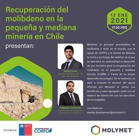 Molymet -con el apoyo de Corfo y la Seremi de MinerÃa- realizará un webinario acerca de la recuperación de molibdeno en la pequeña y mediana minerÃa, generado a través de una innovación tecnológica desarrollada por la propia compañÃa nacional.