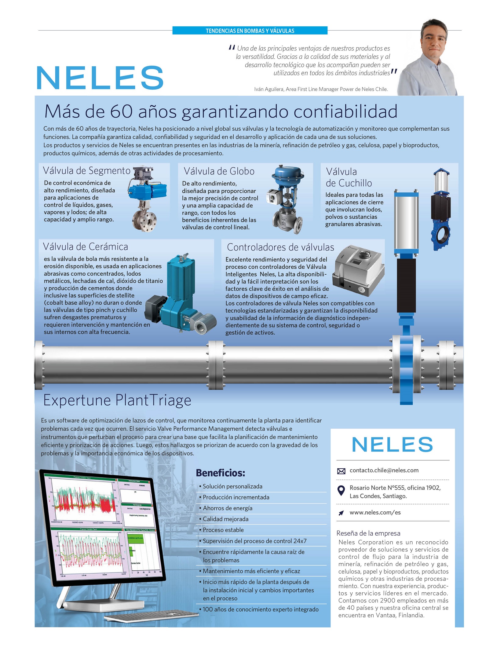 “Una de las principales ventajas de nuestros productos es la versatilidad. Gracias a la calidad de sus materiales y al desarrollo tecnológico que los acompañan pueden ser utilizados en todos los ámbitos industrialesâ€, destaca Iván Aguilera, Area First Line Manager Power de Neles Chile.
