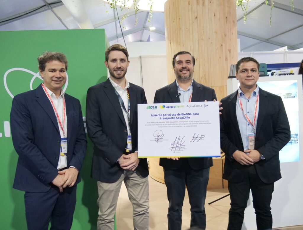 El anuncio se realizó en el marco de AquaSur 2026, donde las compañías confirmaron que comenzarán a utilizar BioGNL (gas natural licuado renovable) como combustible en los camiones que trasladan productos de AquaChile, consolidando un nuevo paso en la transición hacia combustibles más sostenibles en el transporte de carga.