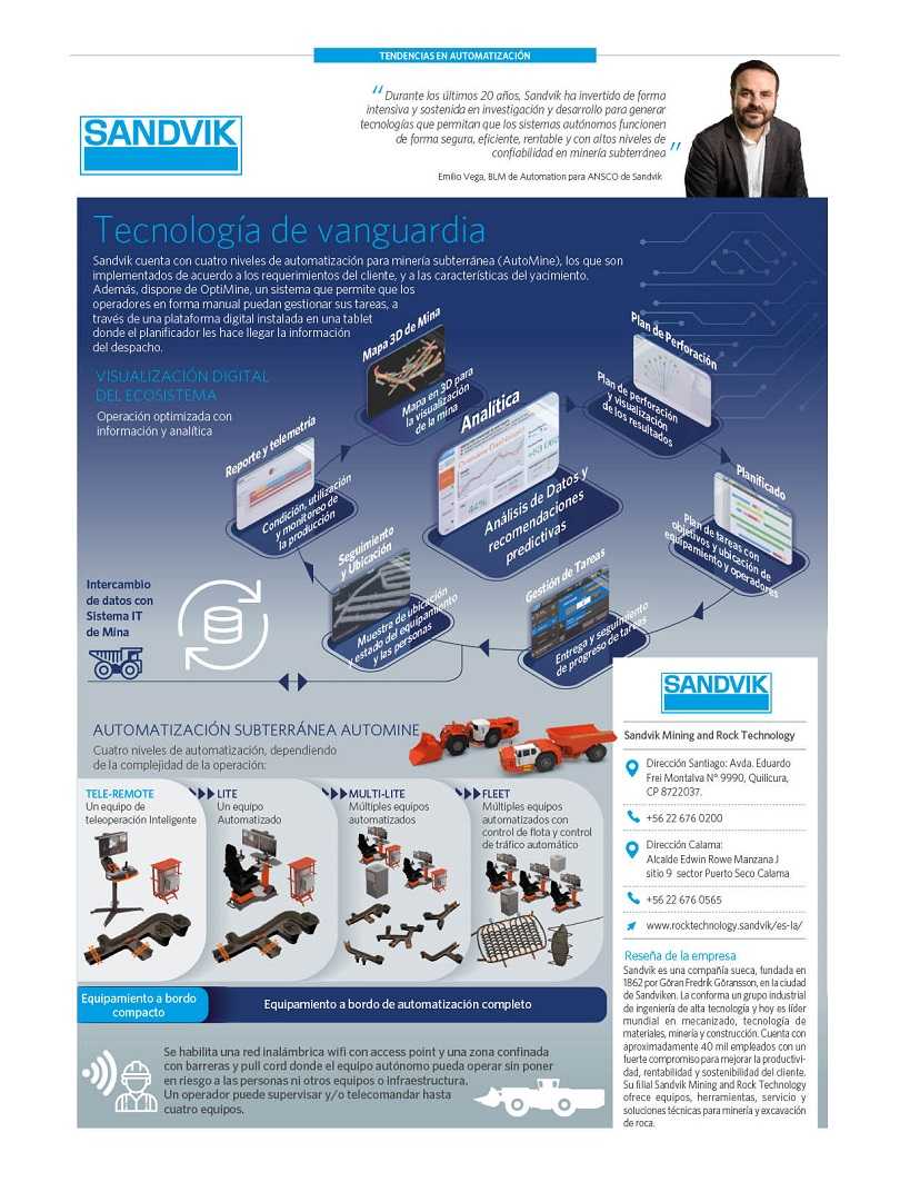 “Durante los últimos 20 años, Sandvik ha invertido de forma intensiva y sostenida en investigación y desarrollo para generar tecnologÃas que permitan que los sistemas autónomos funcionen de forma segura, eficiente, rentable y con altos niveles de confiabilidad en minerÃa subterráneaâ€, resalta Emilio Vega, BLM de Automation para ANSCO (Andean and South Cone) de Sandvik.