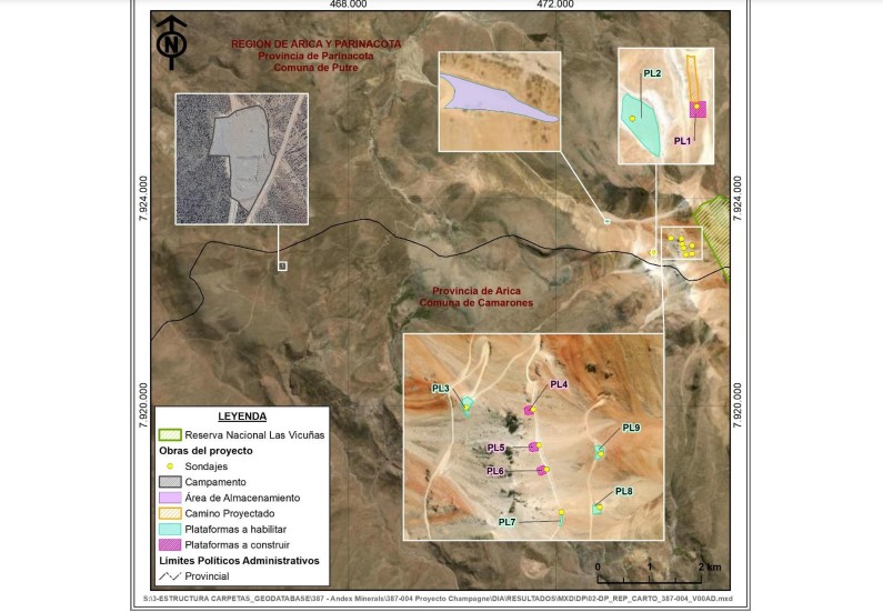 La exploración se realizará en un perÃodo de 28 meses, en un área de aproximadamente 1,37 hectáreas dentro de la propiedad minera de Andex Minerals, emplazada en el sector de Anocarire, entre las comunas de Putre y Camarones, Región de Arica y Parinacota.
