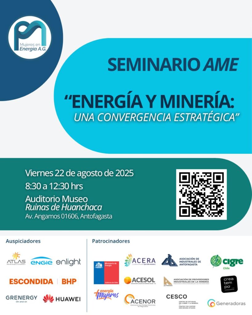 Organizado por la Asociación de Mujeres en EnergÃa de Chile (AME) y respaldado por auspiciadores como BHP, Engie, Grenergy, Atlas Renewable Energy, Enlight y Huawei, junto con el patrocinio del Ministerio de EnergÃa y gremios como la AIA, Aprimin, Acenor, Acesol, Acera y Generadoras de Chile, el encuentro reunirá a especialistas, autoridades y representantes empresariales para abordar las principales oportunidades y desafÃos compartidos por ambos sectores.