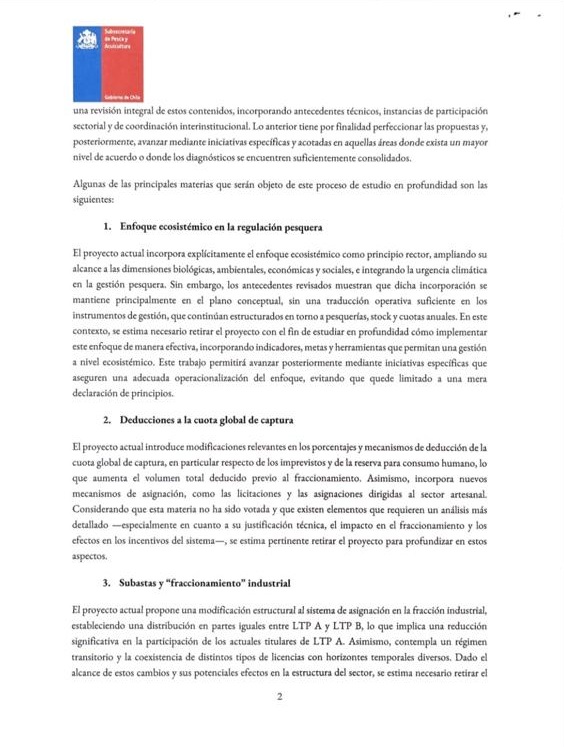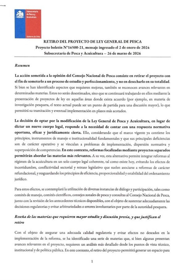 La Subsecretaría de Pesca y Acuicultura (Subpesca) informó el día de ayer, el retiro del proyecto de nueva Ley General de Pesca y Acuicultura, iniciativa que había sido ingresada al Congreso en enero de 2024 por el gobierno del entonces Presidente Gabriel Boric. La decisión busca abrir un proceso de estudio y perfeccionamiento del texto, descartando su continuidad en la forma actual, pero sin desechar los avances contenidos en la propuesta.