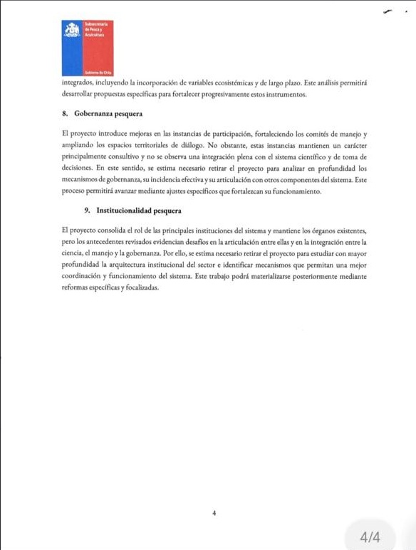 Desde Subpesca se indicó que esta decisión responde a la necesidad de contar con una respuesta normativa eficaz y jurídicamente sólida, considerando que el marco vigente ya contiene los principales instrumentos de manejo, institucionalidad y principios del sistema. En esa línea, se plantea avanzar mediante modificaciones específicas a la legislación actual, en lugar de impulsar un nuevo cuerpo legal de carácter integral.