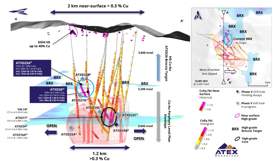 ATEX Resources anunció los resultados parciales de los ensayos del taladro ATXD23A, el primer taladro de su campaña de perforación de Fase V en el Proyecto de Cobre-Oro Valeriano, ubicado en la Región de Atacama, Chile.